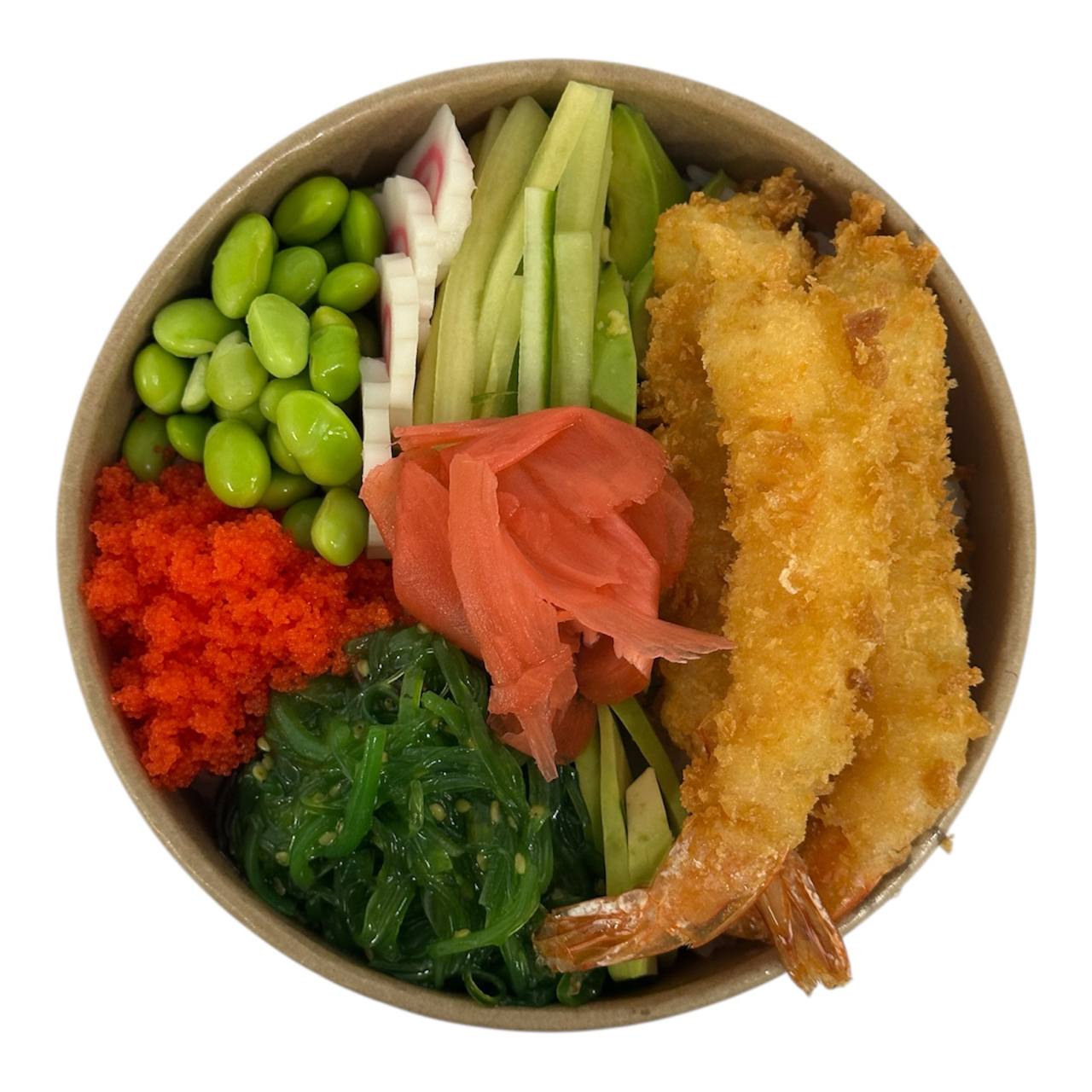 krewetka, ogórek, wakame, naruto maki, awokado, fasola edamame, kawior masago, imbir, sos teriyaki, sos majo-sriracha.