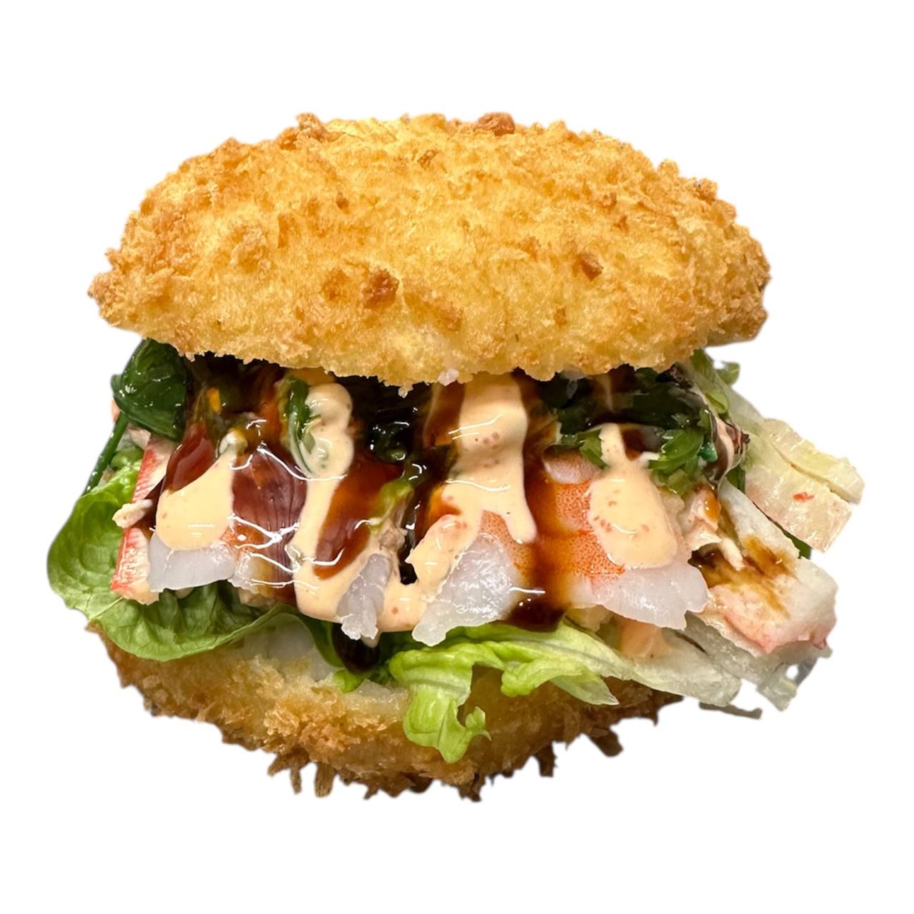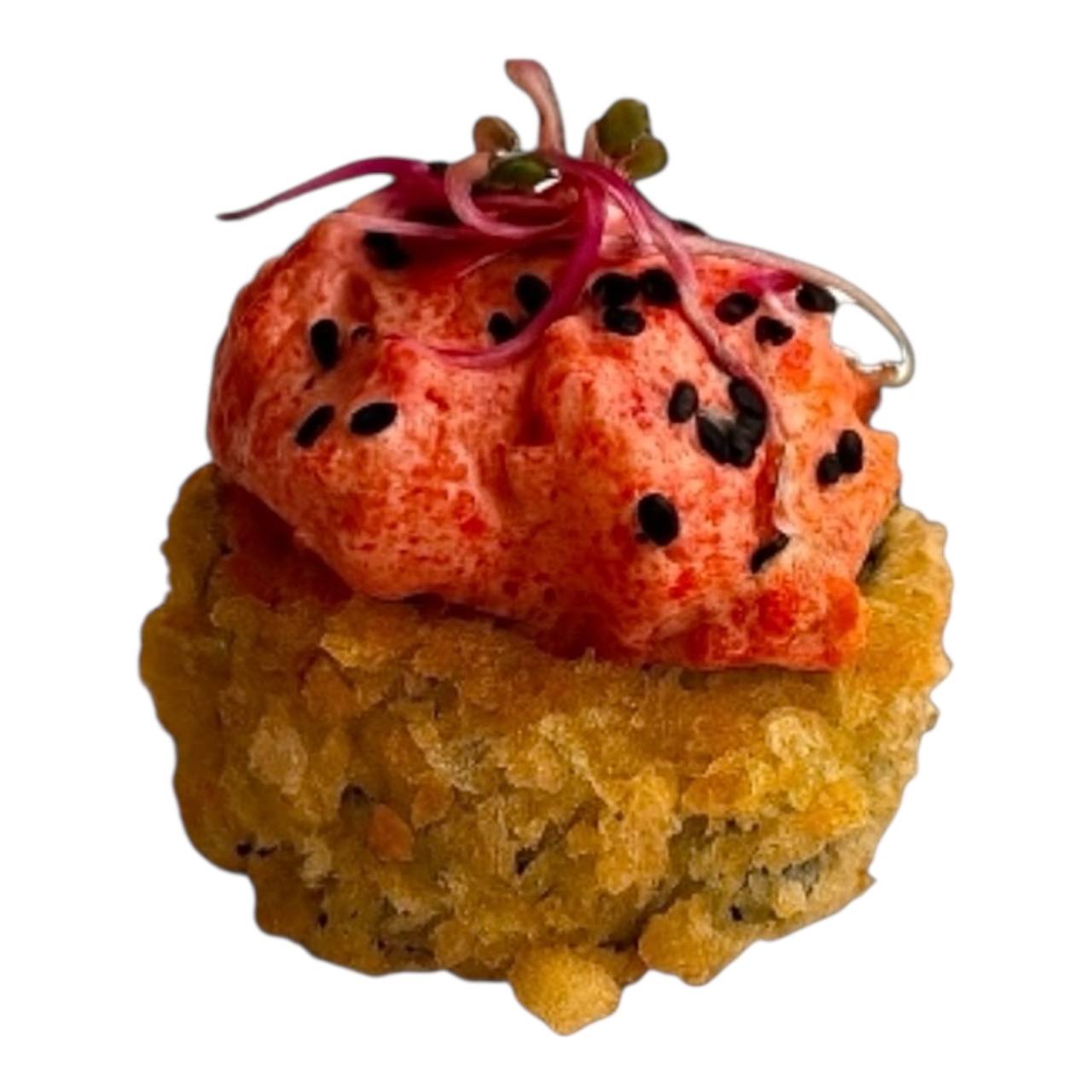 krewetka, ser śmietankowy, kawior, sos majo-sriracha, ogórek, tykwa kanpyo.