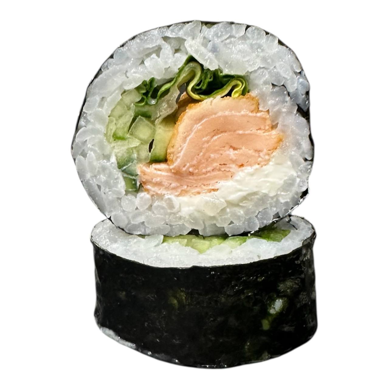 łosoś, ogórek, wakame, imbir, ser śmietankowy, sezam, sos majo-sriracha